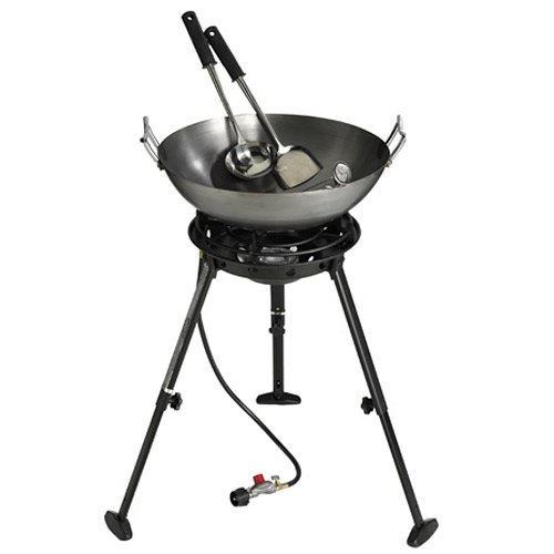 - Outdoor cooking kit with 22-inch wok, large propane burner, spatula, spoon, thermometer, and cooking CD